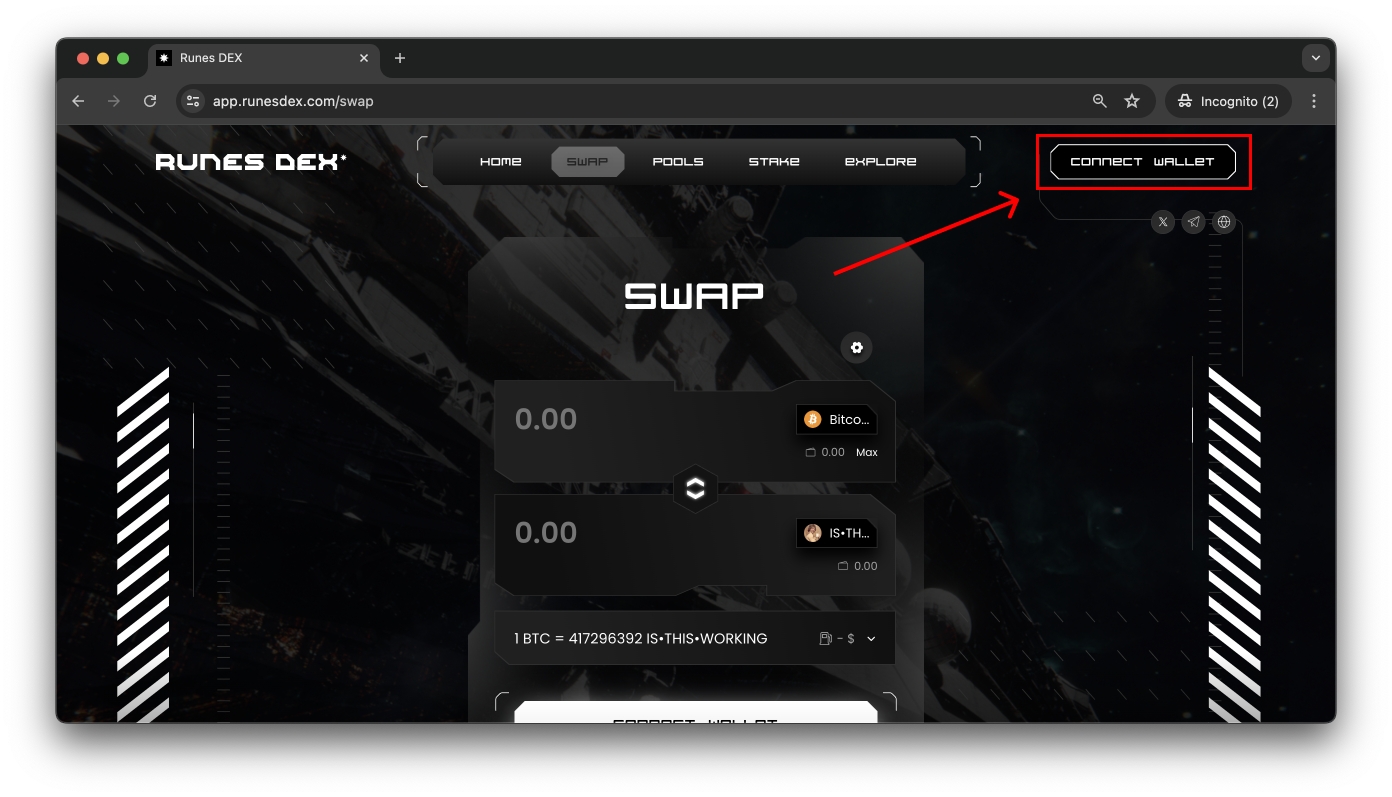 Before started you should install wallet compatible with BTC and Runes protocols. You can learn how to get it here.
